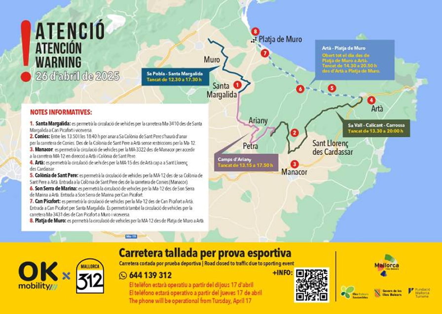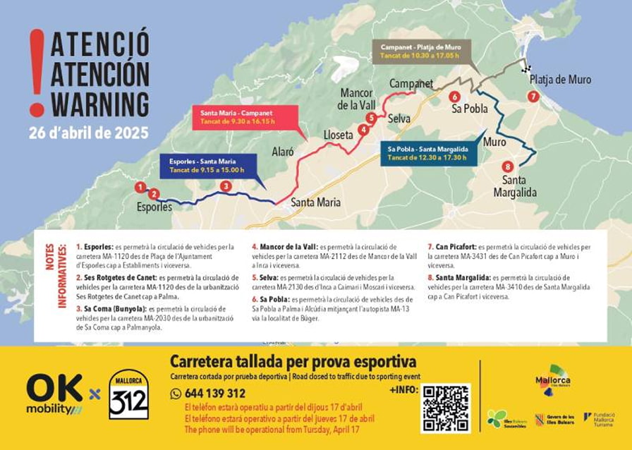 Las carreteras cortadas por la Mallorca 312, que se celebrará el sábado 26 de abril, provocará cortes en circulación de vehículos. Las carreteras de la zona Norte, de la Serra de Tramuntana, del Pla y del Llevant tendrán restricciones desde las 5 hasta las 21 horas para la seguridad de los 8.000 ciclistas que participarán. Se adjuntan planos detallados.