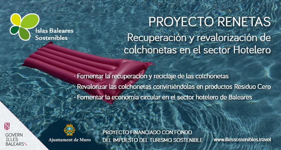 El proyecto Renetas está financiado por el Fondo del Impuesto de Turismo Sostenible. Esta iniciativa consiste en la recogida de colchonetas y flotadores, utilizados por los turistas, que no se pueden reciclar al estar fabricadas con PVC y la única solución para eliminar estos residuos es a través de la incineración.